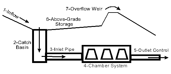 System OperationA typical underground storage system is illustrated above. This diagram shows not only the basic chamber system, but also the auxiliary storage provided by the inlet pipe, catch basin, and above-grade storage. The system also has an overflow weir, in the event that all the available storage is utilized. The basic system operation is as follows: 1) An inflow hydrograph is routed to the system. This could be a single subcatchment, or the final flow from a complex watershed model. 2) The inflow enters the underground system through a catch basin. Although there will typically be a grate at the inlet, this example assumes that the inlet will not significantly reduce or detain the inflow, and therefore the grate is not represented in the HydroCAD model. 3) An inlet pipe conducts water from the catch basin to the actual chamber system. The pipe should be large enough so the catch basin and chamber system can equalize and maintain the same WSE at all times. 4) The chamber system provides the primary storage volume for the pond node. This is typically modeled using the HydroCAD chamber wizard. When modeling exfiltration into the surrounding ground, an exfiltration outlet is also included in the pond. 5) The final outlet control may be designed to drain the system over a certain time period, or it could be a complex multi-stage outlet optimized for multiple storms. There may also be an exfiltration outlet (not shown). 6) If the chamber system fills completely, the WSE elevation will continue to rise in the catch basin, eventually reaching the rim and ponding in the above-grade storage volume. 7) If the above-grade storage fills completely, any excess will be handled by the overflow weir. Setting up the HydroCAD ModelBased on the operation discussed above, the HydroCAD pond would include the following elements. Outlet definitions: