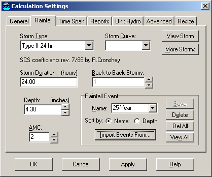 2) Select the Rainfall tab, as shown at the right. 3) In the Storm Type box, select the one of the predefined rainfall distributions from the drop-down list, such as the Type II 24-hr. 4) Type the desired rainfall Depth for your first event. 5) Click inside the box for Rainfall Event Name and type the corresponding event name (e.g. 25-year). Do not select from the drop-down list or you will recall an existing event. If this occurs, simply go back to step 3. 6) Click the Save button. (Do not click OK or apply at this time.) 7) Repeat steps 3-6 for each event. 8) Click View All to see a complete list of your rainfall events. 9) Click OK twice to return to the main screen. 10) You can now select the desired rainfall event from the drop-down list at the top of the main screen. |